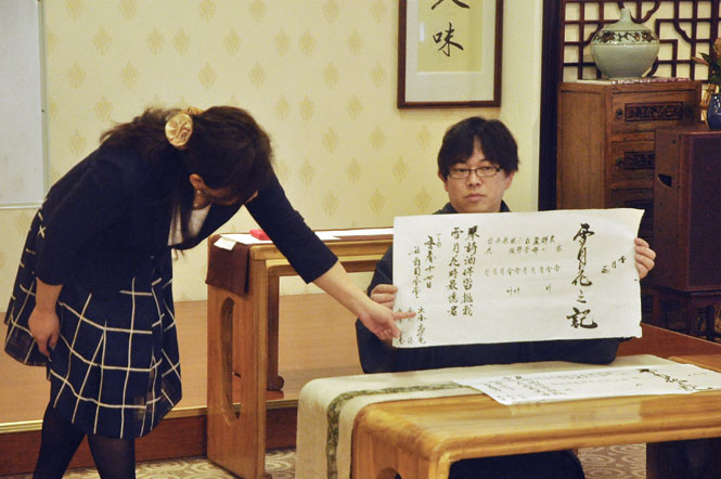 西際重譽寫得一手漂亮的毛筆字,對于香會記中的和歌也信手拈來,這一切都表明他在傳統(tǒng)文化的造詣匪淺。問他是否經(jīng)歷過嚴苛的學習、訓練,西際重譽表示對于傳統(tǒng)文化方面的學習毫無壓力。“從小,琴棋書畫、詩禮茶花這些雅道就圍繞在我身邊,就是我日常生活中的一部分,因此接觸它們也是非常自然的。對于生活中朝夕面對的事物,要了解、甚至是精通它們是非常順理成章的,無需經(jīng)過所謂的刻苦修煉。”