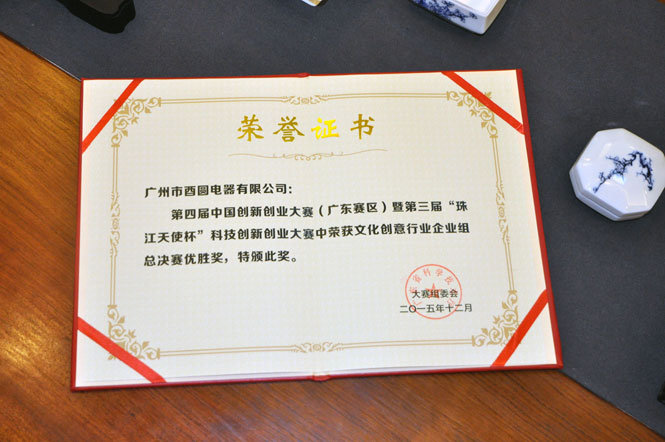 廣州市酉圓電器有限公司參加2015年度第四屆中國創新創業大賽,參賽組別為文化創意行業企業組,經過將近五個月的比賽,歷經廣州市初賽、廣東省半決賽和廣東省總決賽的激烈角逐,最終酉圓電器在廣東省暨第三屆“珠江天使杯”科技創新創業大賽文化創意行業企業組總決賽中榮獲《優勝獎》榮譽,此份榮譽是酉圓在文化創意領域的實力見證。
