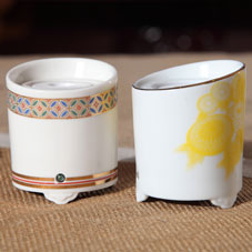 根據傳統空熏法的品香流程體驗,斜口品香器的造型設計更容易使香味聚集。采用臺灣陶瓷工藝,爐身繪銅錢或菊花圖案,銅錢寓意財富,菊花寓意雅潔。品香器首次采用了瓷器描金工藝,燦爛華貴。器形小巧,內帶可充電鋰電池,溫度調節范圍為50~250℃,爐底為拔盤式調溫,使用簡單方便。