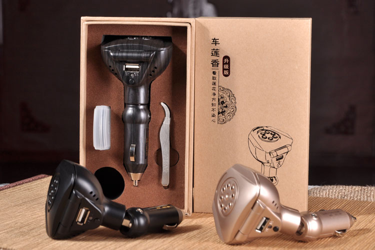 其設計理念來自于蓮花,盛唐著名詩人孟浩然在《題義公禪房》中有云:“看取蓮花凈,方知不染心”,佛家以之代表清凈;北宋理學鼻祖周敦頤在《愛蓮說》中有云:“予獨愛蓮之出淤泥而不染...蓮,花之君子者也”,儒家以之代表廉潔。該產品使用汽車點煙器來供電,在車內配合沉香使用可以起到祛除異味、凈化空氣、消毒殺菌、香薰養生等作用。此升級版增加了USB供電接口,熏香的同時可以給手機等移動設備供電,使用更加方便。車蓮香升級版,以汽車為場景,以蓮花為意境,以沉香為功用,簡潔高雅,為有車一族健康養生必備尚品。